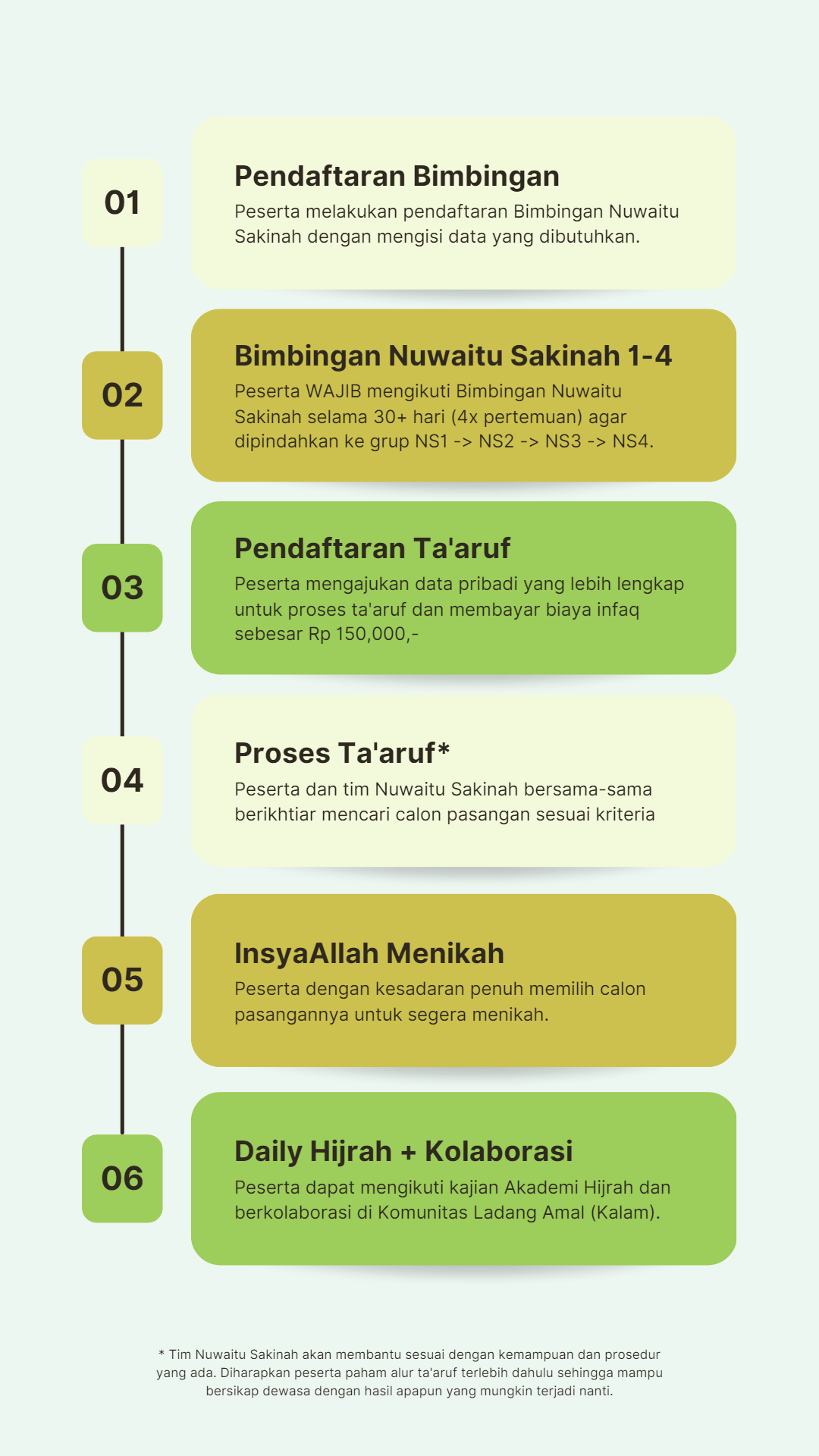 Nuwaitu Sakinah adalah program bimbingan ta’aruf selama 30+ hari (4x pertemuan) yang dilaksanakan secara online, biasanya via Zoom Meeting.